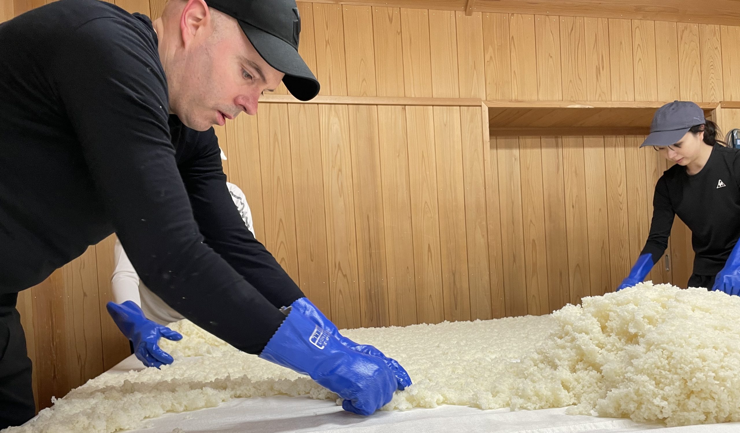 収穫された酒米「吟風」は精米され、洗米、浸漬、蒸米を経て、シェニョンシェフも参加した麹づくりの工程へ。